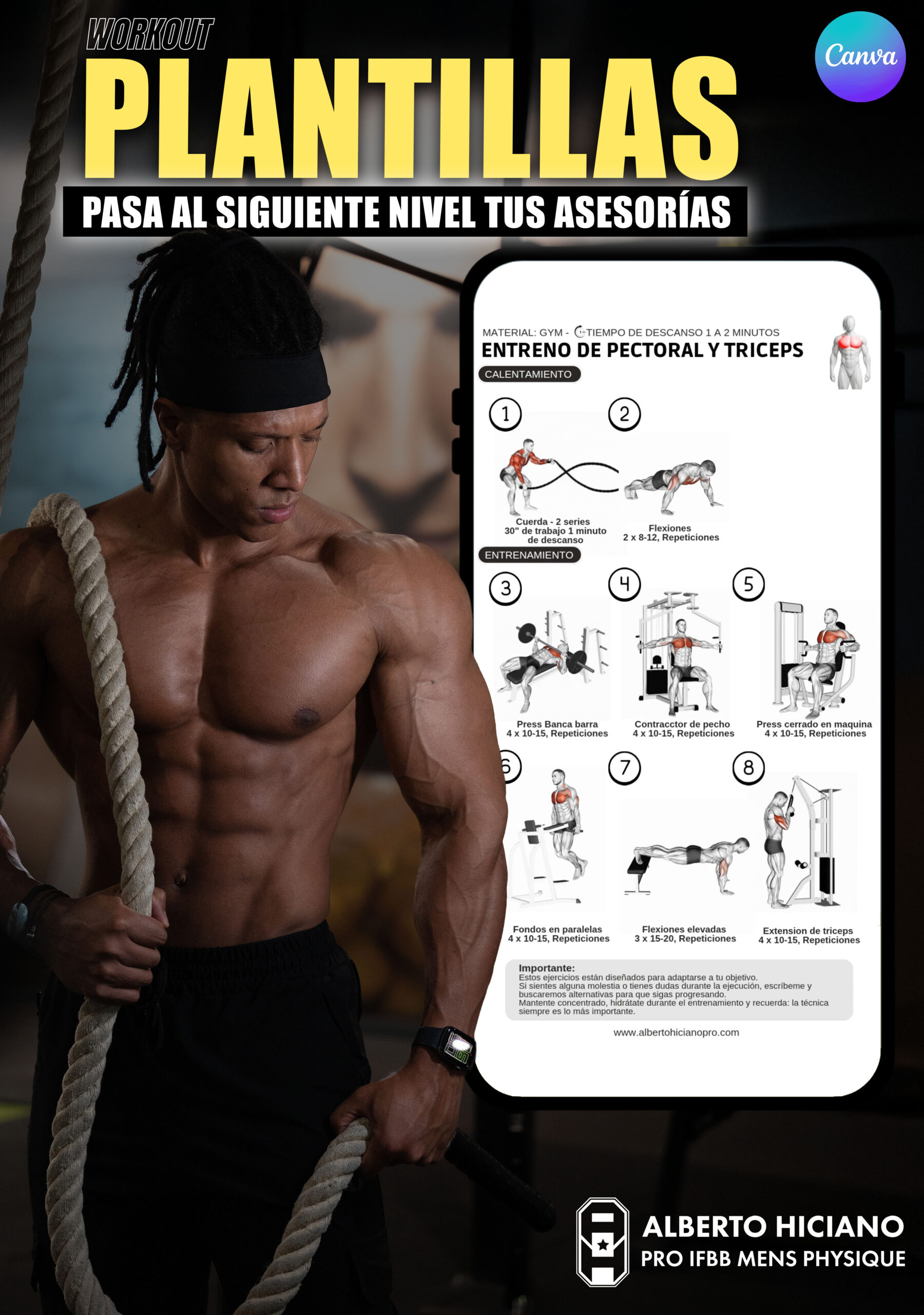 Con esta plantilla editable en Canva, podrás diseñar planes de entrenamiento totalmente adaptados a tus clientes sin necesidad de conocimientos de diseño. Incluye packs de ejercicios en GIF, para que tus rutinas sean visuales, fáciles de entender y mucho más atractivas.
